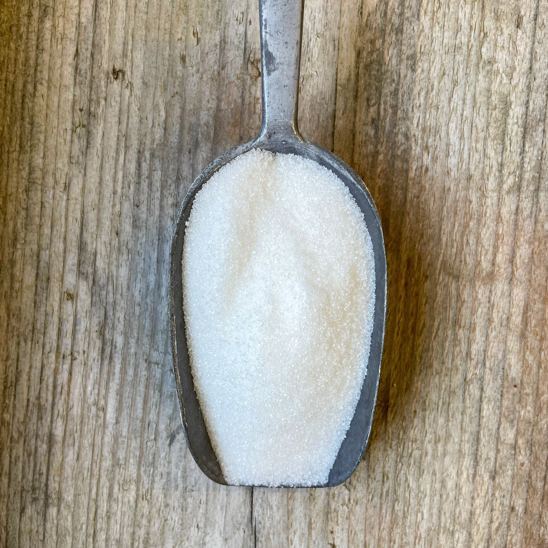 White granulated sugar, is a slightly coarser grain of sugar sometimes known as refined sugar or table sugar, and a staple for the cupboard.