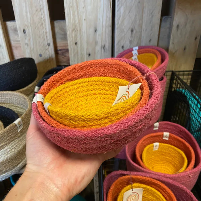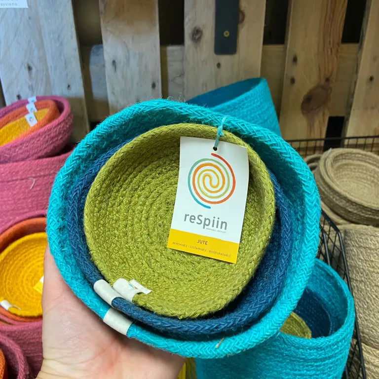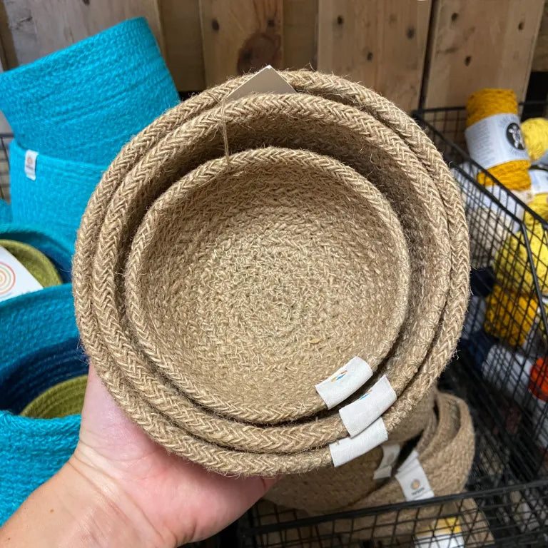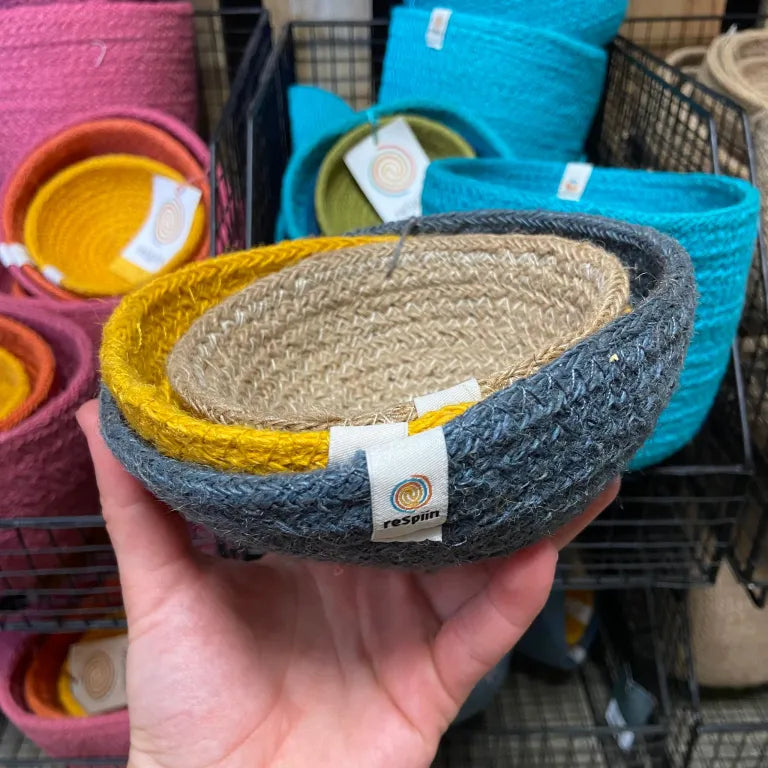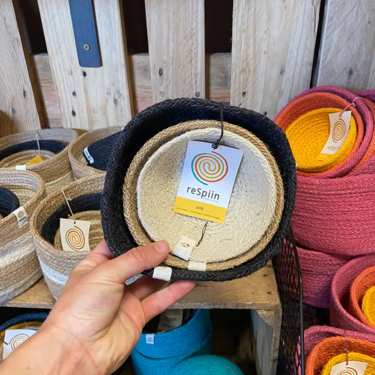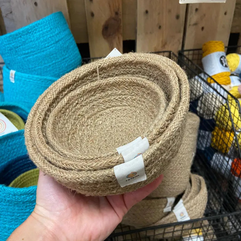 This set of three natural nesting storage bowls are woven by hand from renewable and sustainable jute fibres and feature a little fabric ReSpiin label stitched onto the rim.