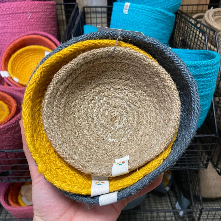 The baskets and bowls are made from both natural jute and coloured jute. The coloured jute is 100% Azo free.