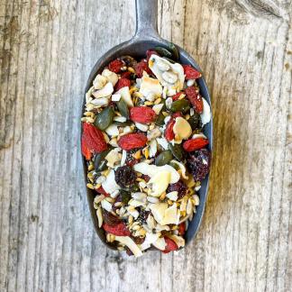 Ingredients: goji berries, chia seeds, coconut chips, golden linseed, flaked almonds, cranberries, sultanas, sunflower seeds, pumpkin seeds,