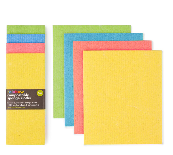 4 pack or 6 pack of compostable sponge cloths. Made in Europe. A set of 4 different water-based prints on a biodegradable sponge cleaning cloth