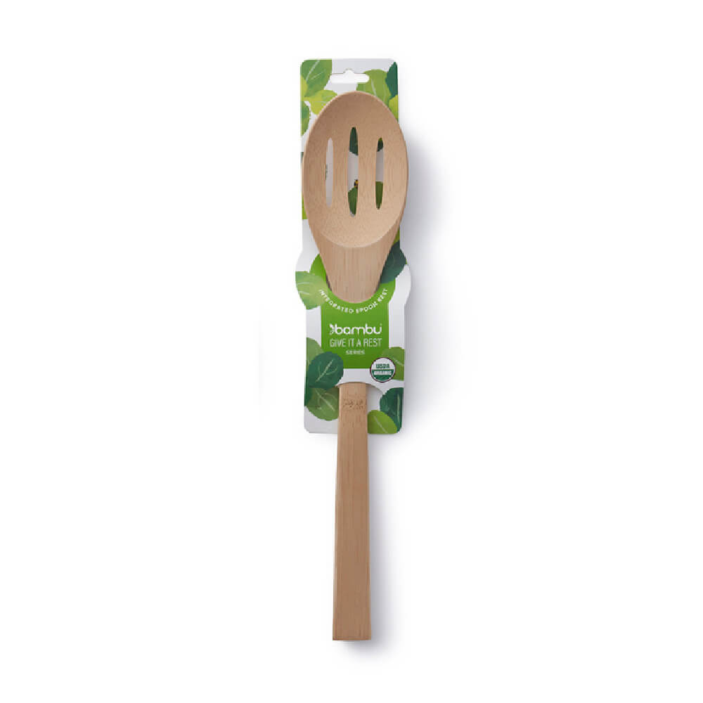 This bamboo oval-shaped spoon has a small patented bump (a unique characteristic of how bamboo grows) on its back that keeps the spoon from touching the surface when set on counters and stoves.