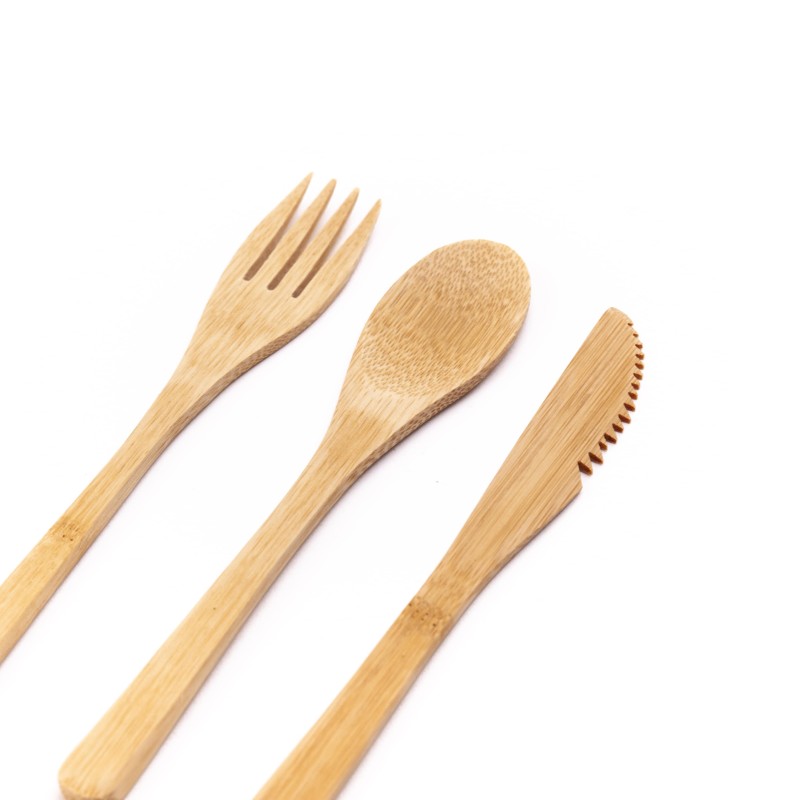 Lightweight bamboo cutlery for on-the-go eating, featured in this image alongside the chopsticks & spork.