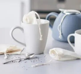 Made of GOTS certified organic cotton. The string is long enough for using this bag with mugs or with a teapot: natural unbleached cotton, with no dye.