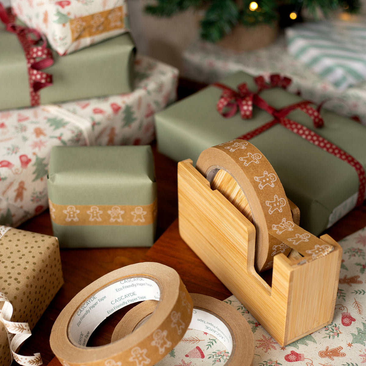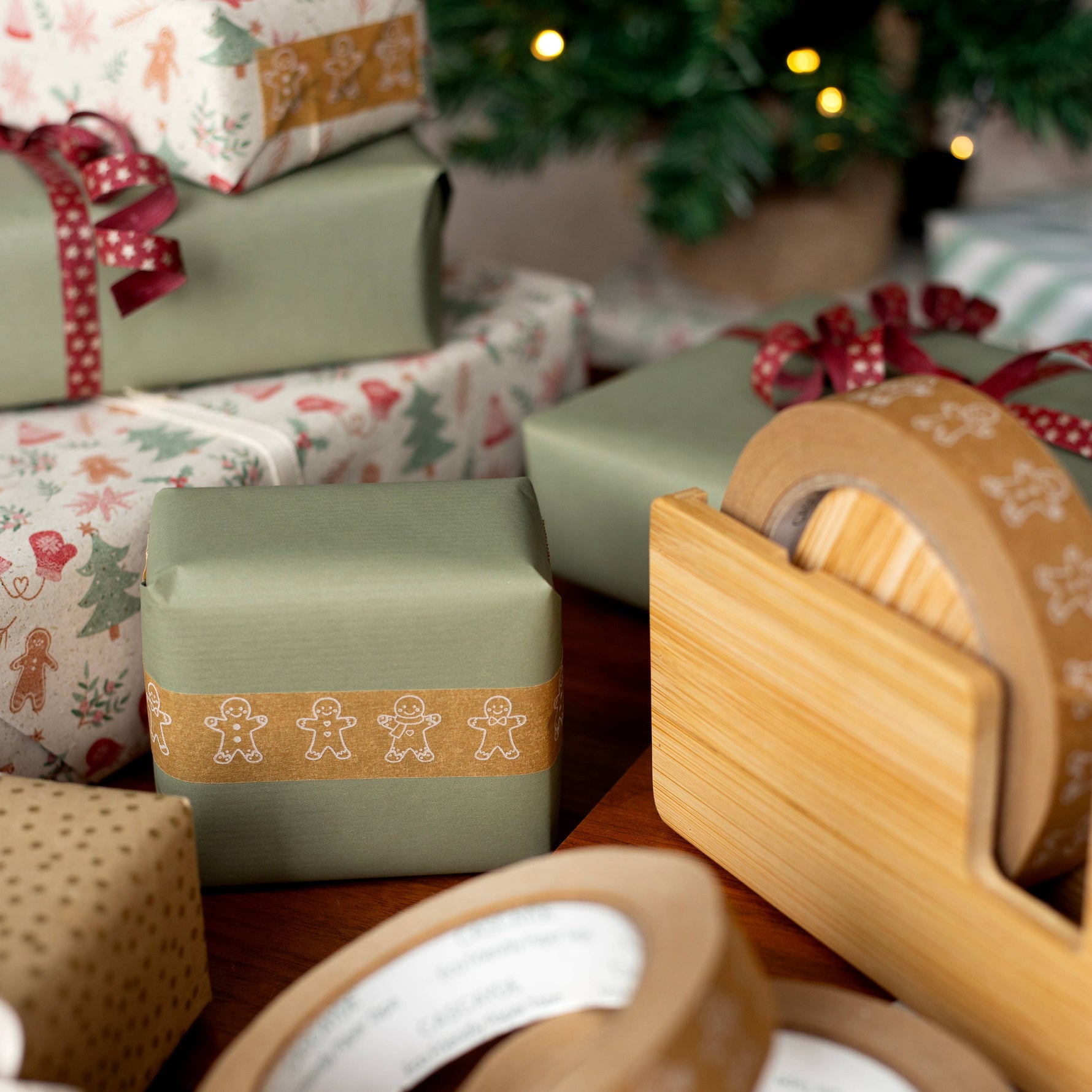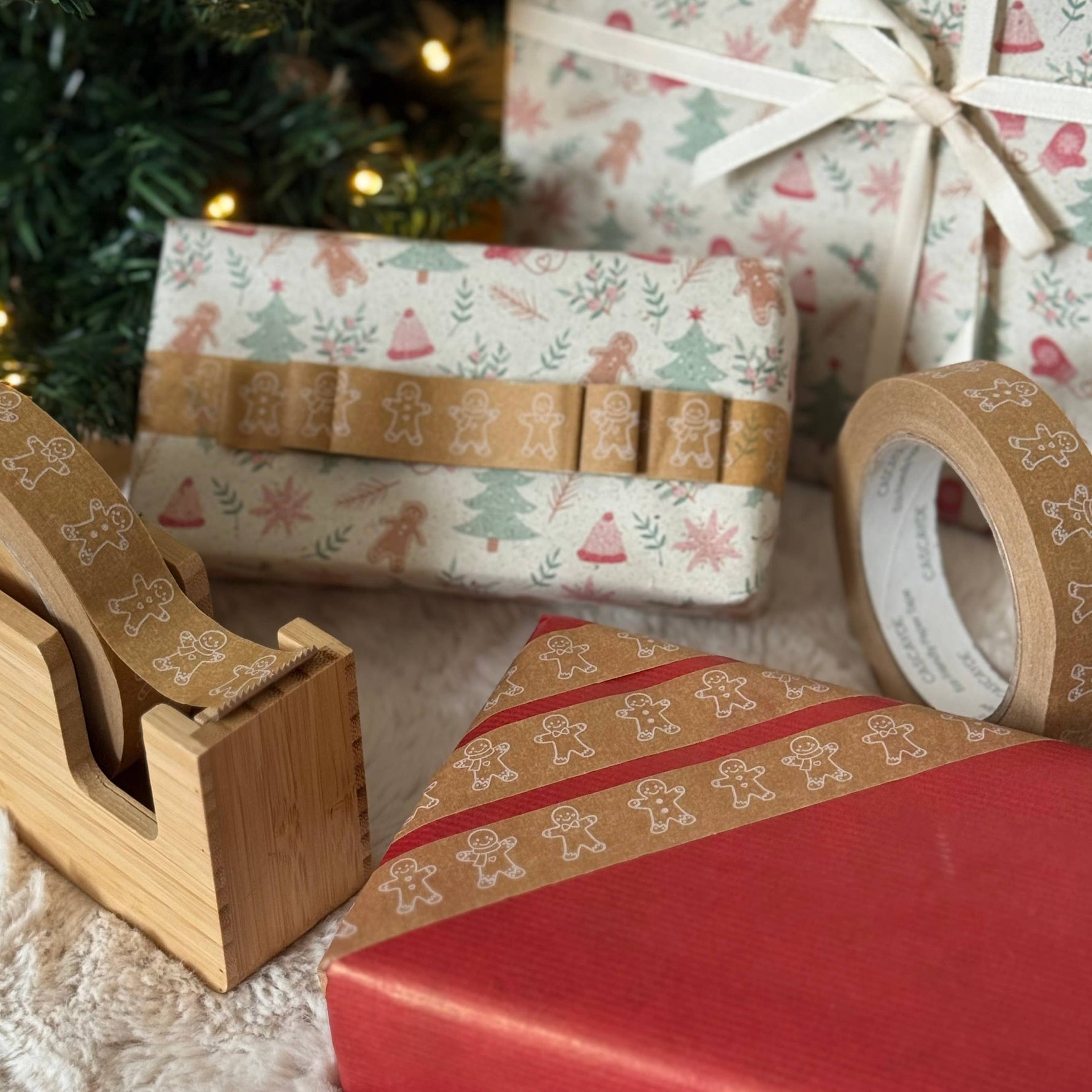 Plastic free & fully recyclable, Natural plant-based adhesive, Vegan ink, Sustainably sourced kraft paper, Tears easily from the roll, Made in the UK, Compatible with standard tape dispensers. Fun Gingerbread designs – perfect for festive wrapping!