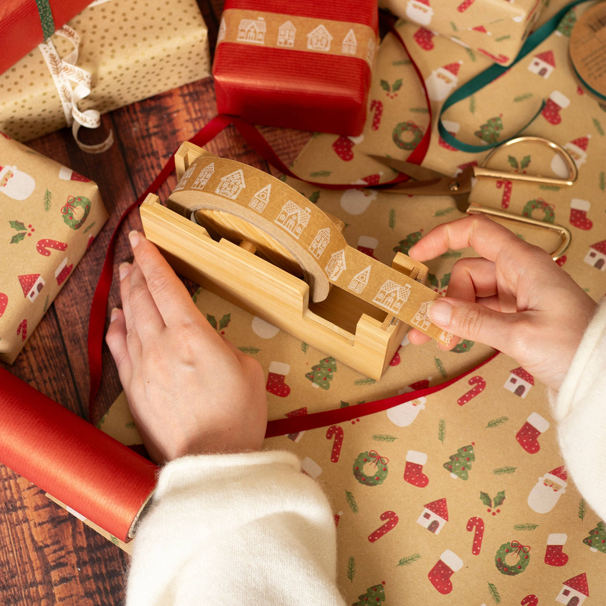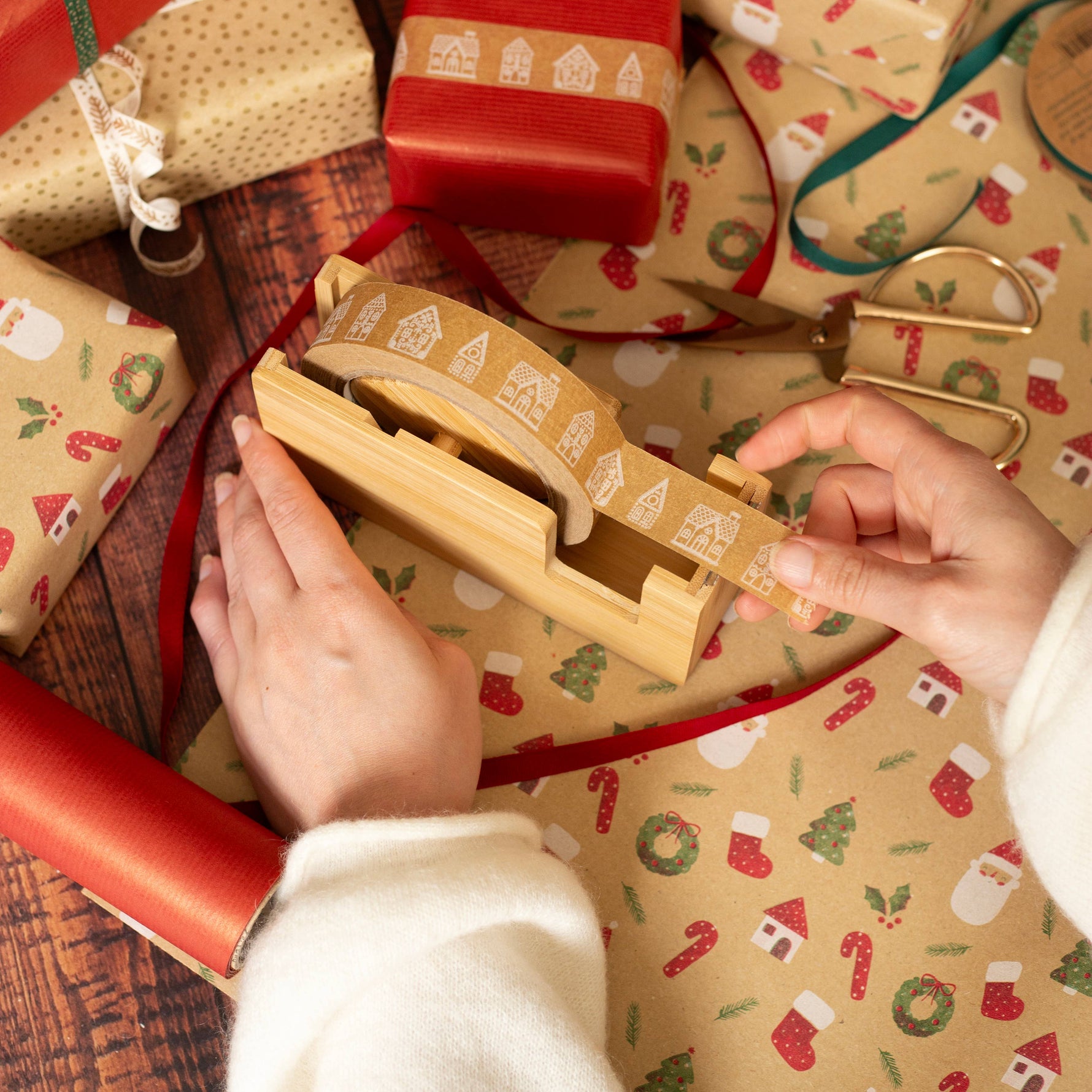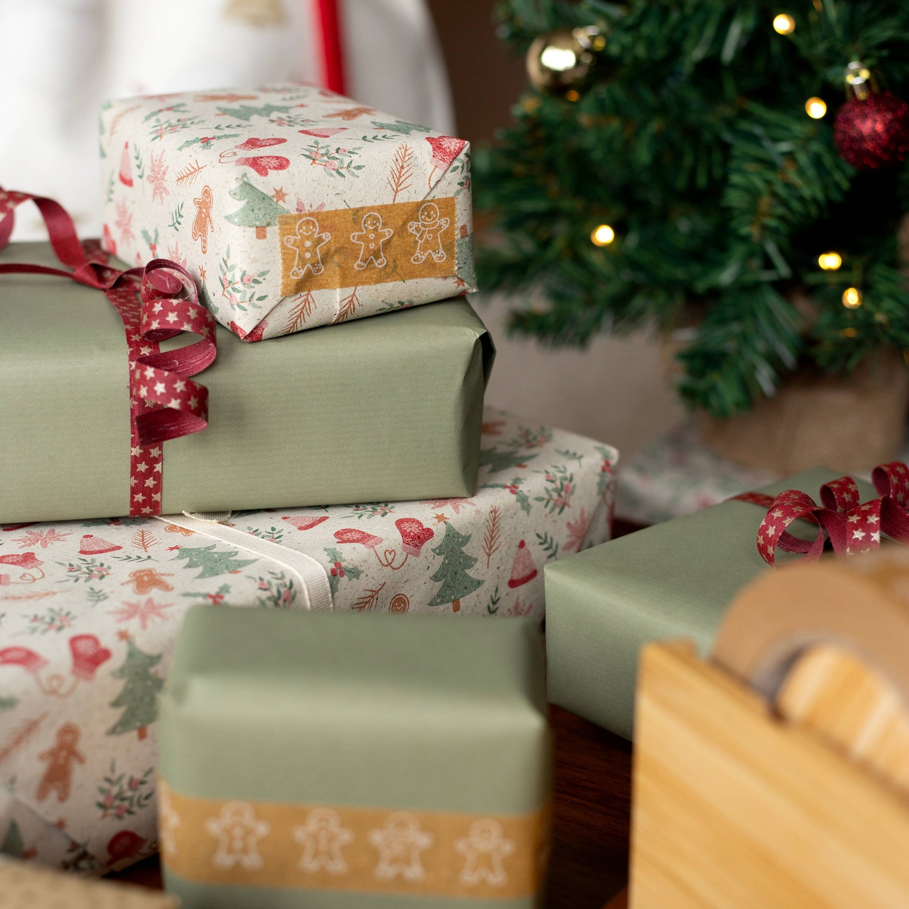Plastic free & fully recyclable, Natural plant-based adhesive, Vegan ink, Sustainably sourced kraft paper, Tears easily from the roll, Made in the UK, Compatible with standard tape dispensers. Fun Gingerbread designs – perfect for festive wrapping!