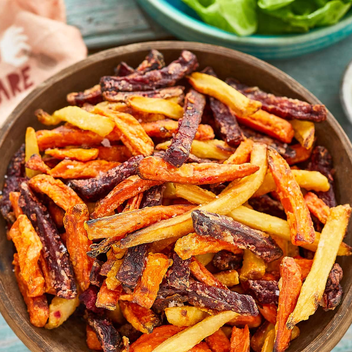 A nutritious and delicious mix of carrot, parsnip and beetroot chips. A colourful and crunchy alternative to potato fries.