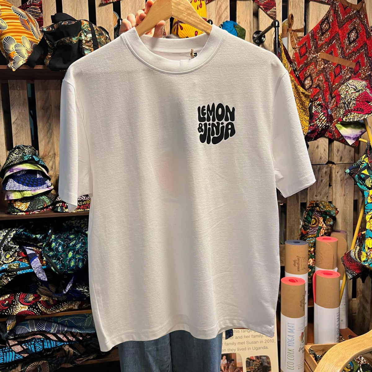 The off-white tees have subtle 'specks', a nod to their sustainable origin - crafted from waste and recycled materials, embracing their raw, unprocessed charm.