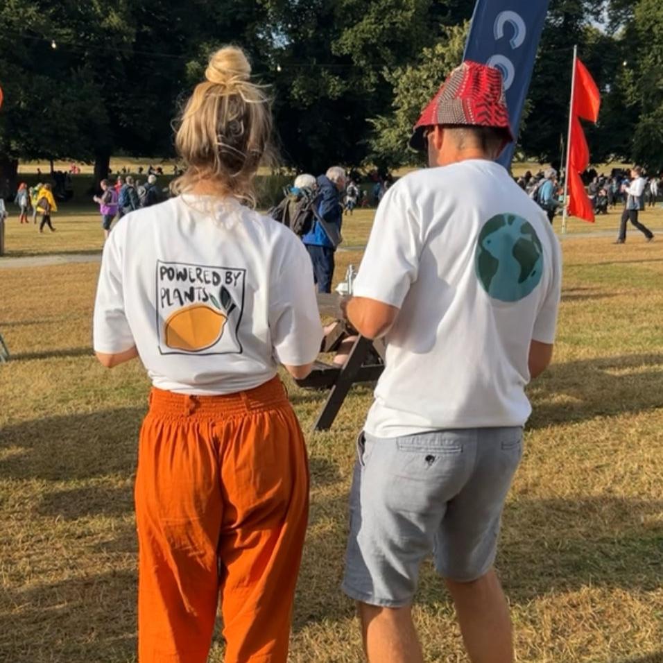 Jess rocks the Powered by Plants tee in size S, styled with an oversized fit and tied up for a playful look. Her father also wears a size S in the Earth tee.