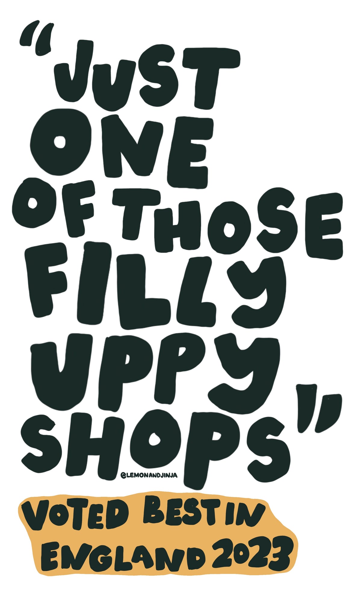 The Story Behind the Design: In July 2022, Lemon and Jinja set up a pop-up shop in the heart of Romsey. While Jess was busy at the counter, a group of adults strolled by, curious about the shop. As they walked away, one of them casually remarked, "Oh, it's just one of those filly-uppy shop things." They didn’t stop to explore, but the phrase stuck with Jess. She was determined to turn it into something special for the shop!
