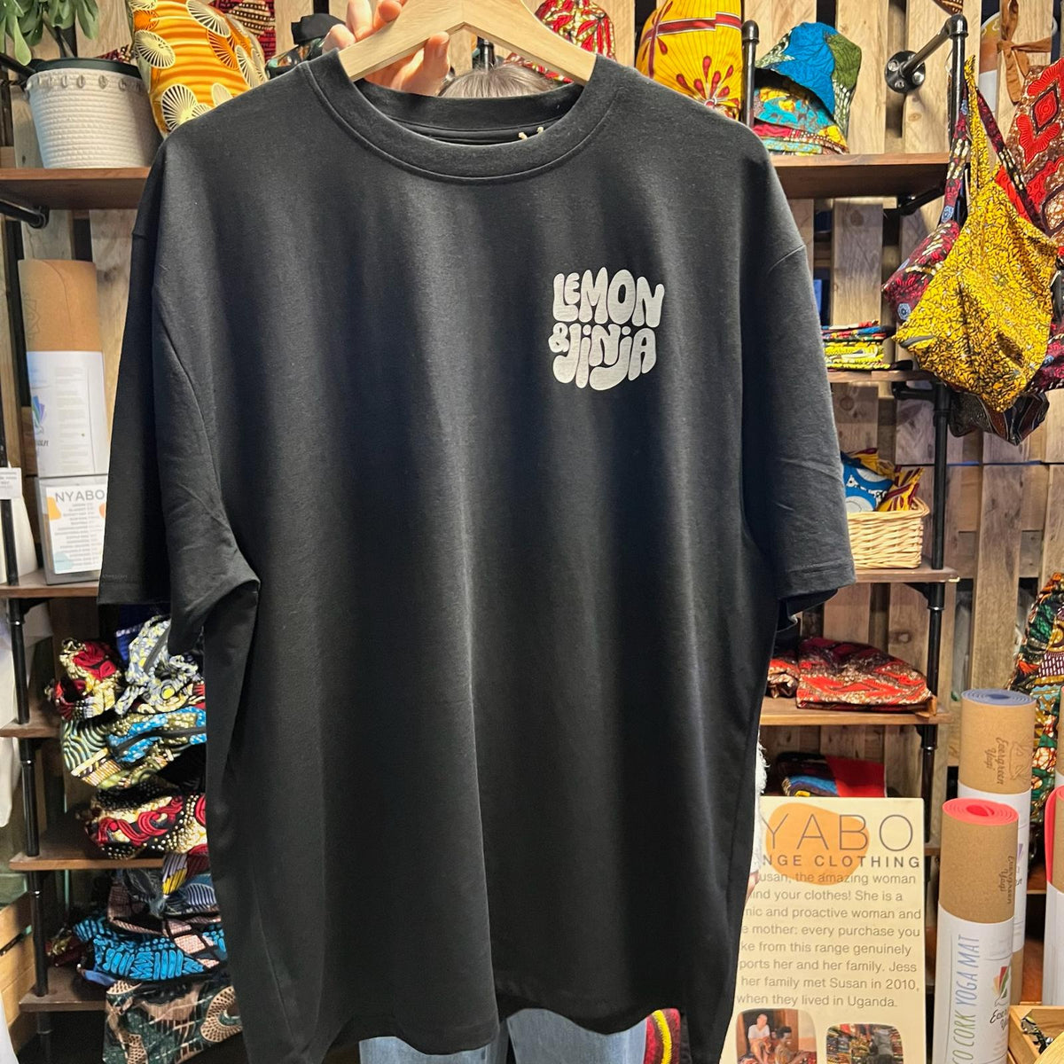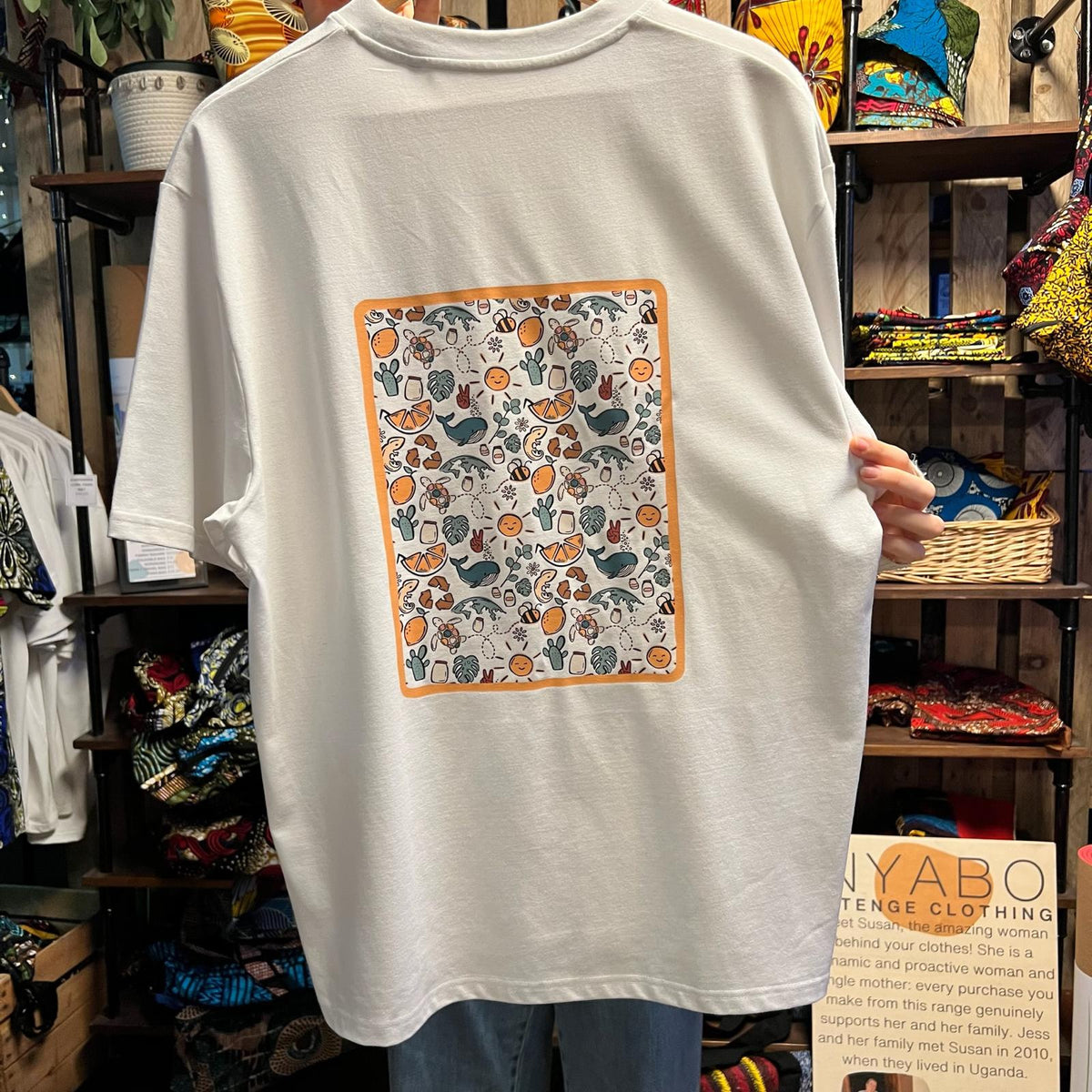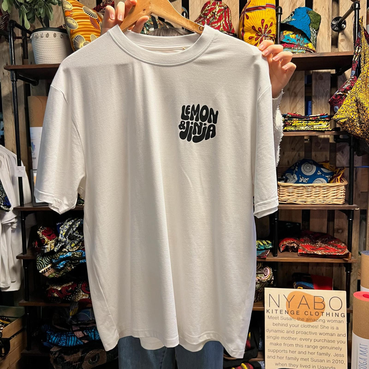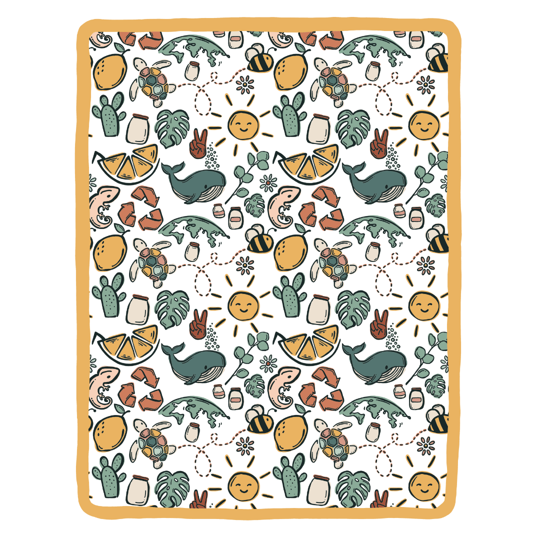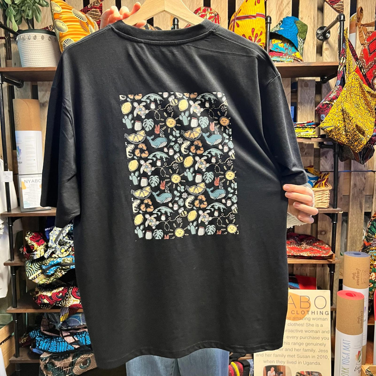 The story behind the design: The t-shirt graphics incorporate symbols that reflect all things Lemon and Jinja: whales (save our seas), chameleons (Jess's personal favorite!), lemons (of course!), the recycling symbol, refill jars, the sun, bees (buzzing for sustainability), the Earth, eucalyptus, cacti, monstera leaves (our love for plants!), a peace sign (because we adore peace), and a turtle!