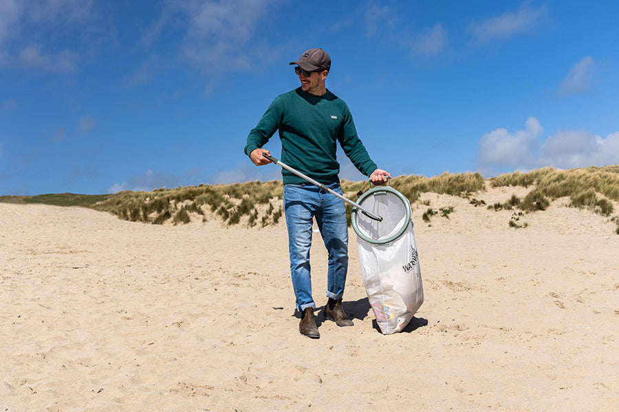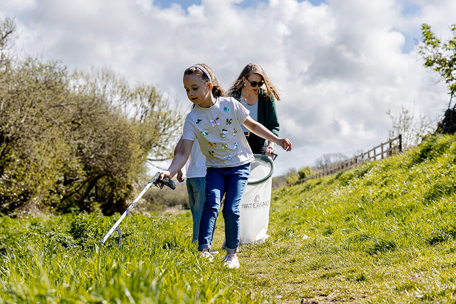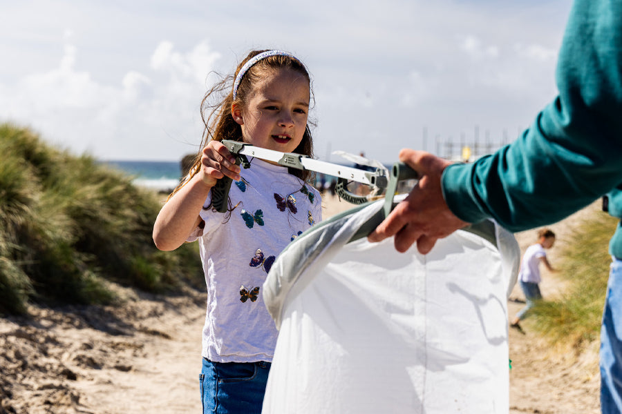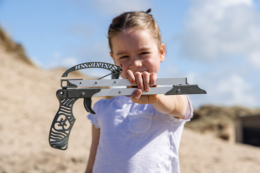 Recycled ocean plastic folding litter picker. Waterhaul created a folding litter picker with the handle, trigger and jaw components made from 100% recycled polypropylene fishing gear. Portable, durable and lightweight to enable you to take positive action against plastic pollution. Modular and repairable for easy maintenance. Made in the UK from Traceable Marine Plastic.