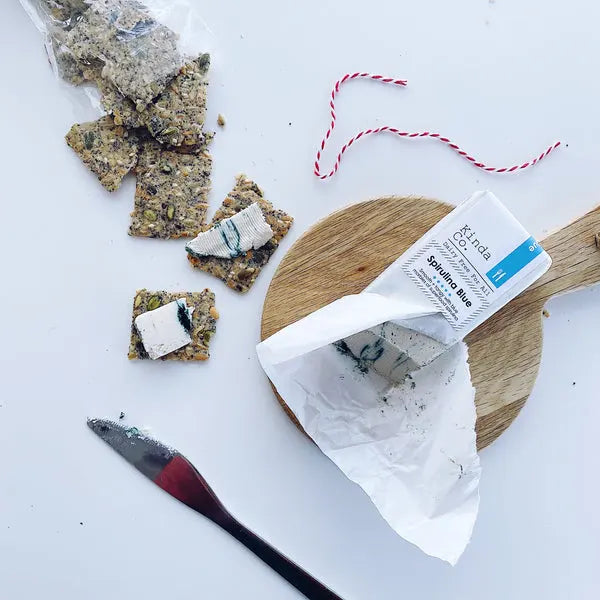 Mild and tangy with blue veins of spirulina, this is a blue cheese for people who aren’t sure if they like blue cheese. Much more easy going than a traditional stilton but still very pleasing on the tastebuds and as a bonus looks great on a cheeseboard. Also delicious in a pear and walnut salad!