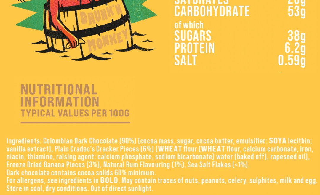 Drunk'n Monkey: Spiced rum, banana chip, salted cracker. 150g (allergens and ingredients in photos)