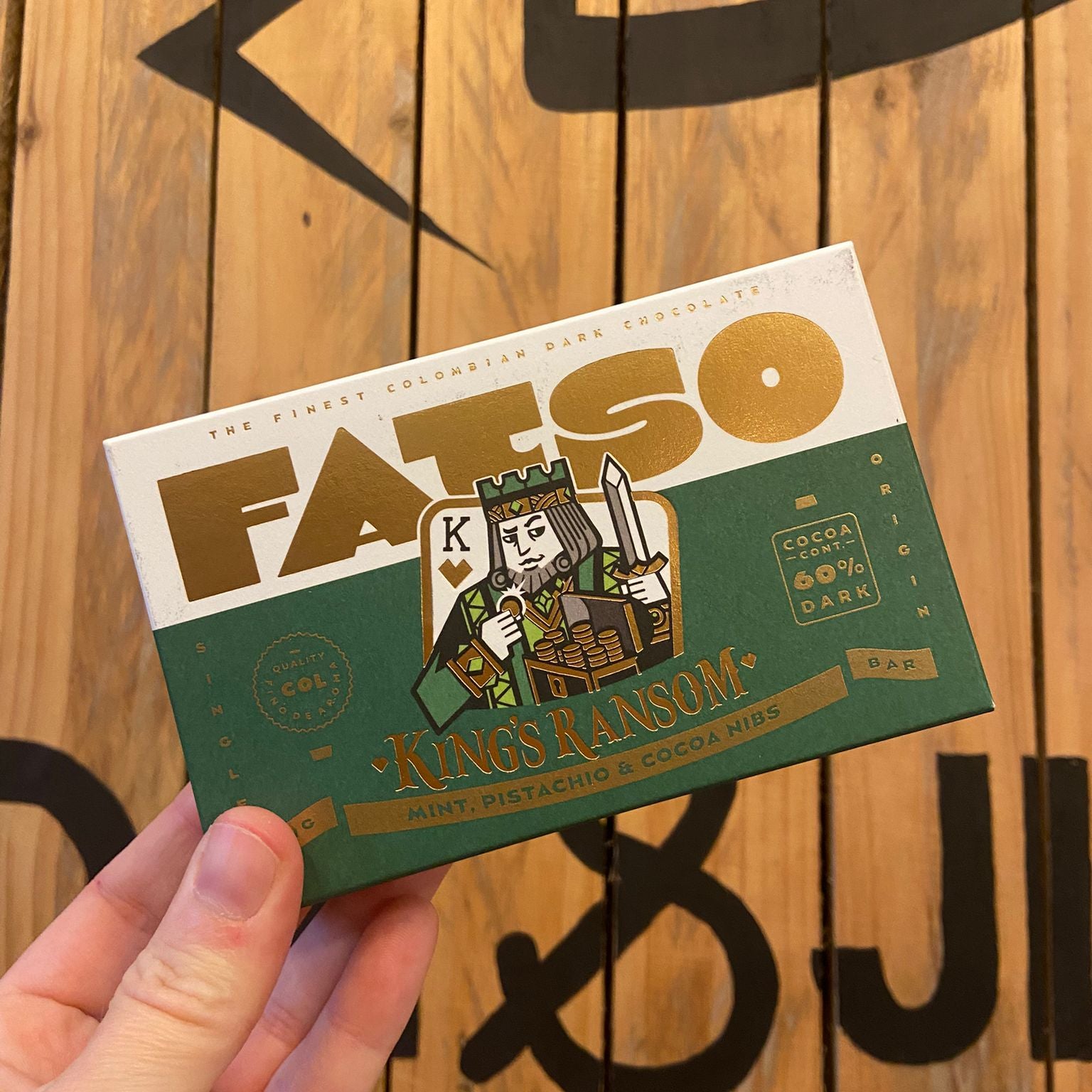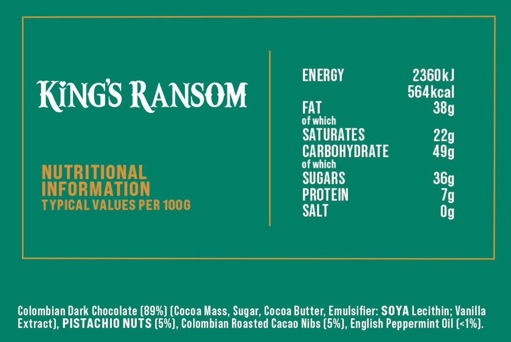 King's Ransom: Mint, pistachio and cocoa nibs. 150g (allergens and ingredients in photos)