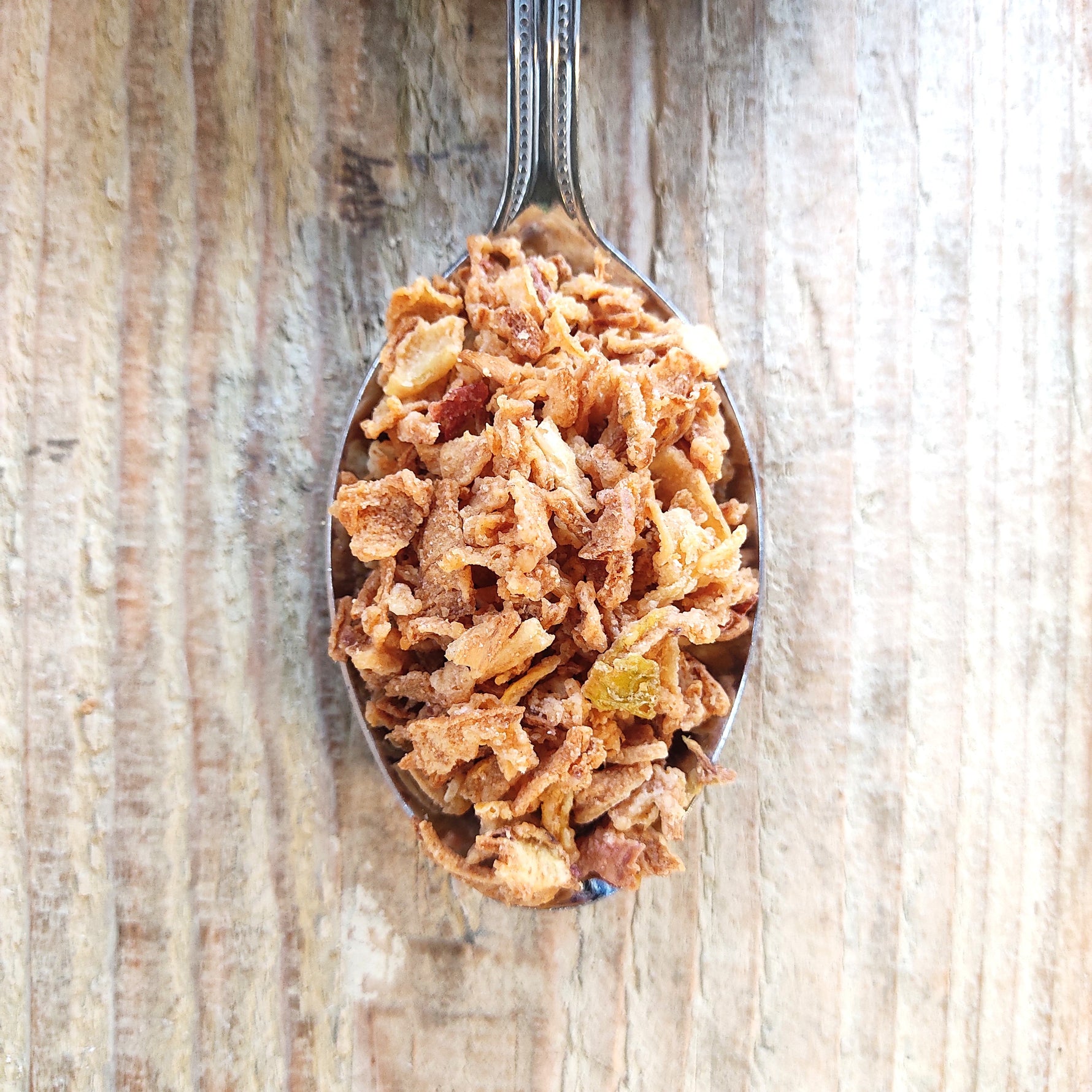 Crispy Fried Onions are thinly sliced onions deep-fried in oil till golden brown and crisp. Use these for making curries, biryani, soups, and dals. Sprinkle on top of salads for a delicious crunch and flavour.