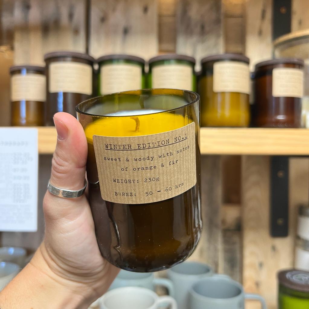 Handmade rapeseed wax candles using old recycled wine bottles as the jar. These are lovingly handmade in Dorset with custom blends of essential oils.