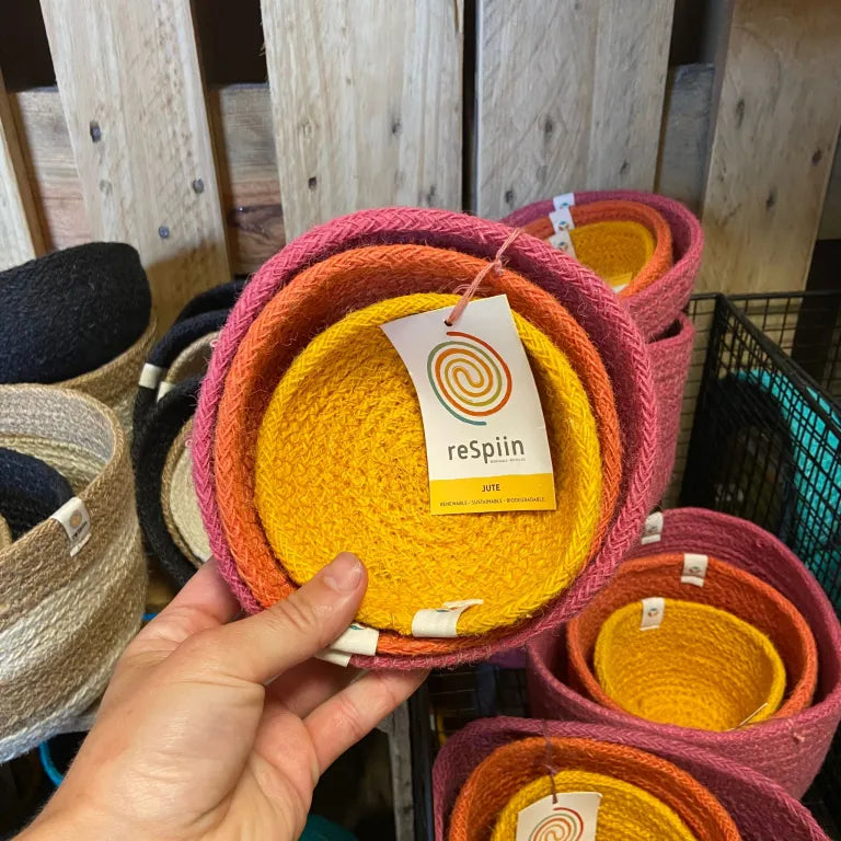 This set of three natural nesting storage bowls are woven by hand from renewable and sustainable jute fibres and feature a little fabric ReSpiin label stitched onto the rim.