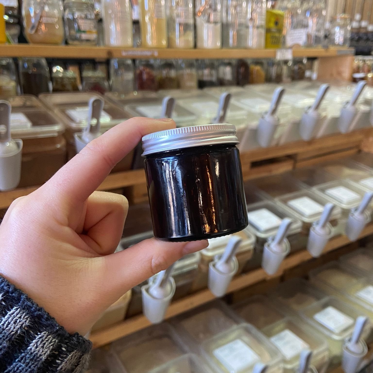 Amber Glass Jars 60ml in size. They have a 53mm neck and aluminium lid. Not food safe but appropriate for moisturisers, scrubs etc.