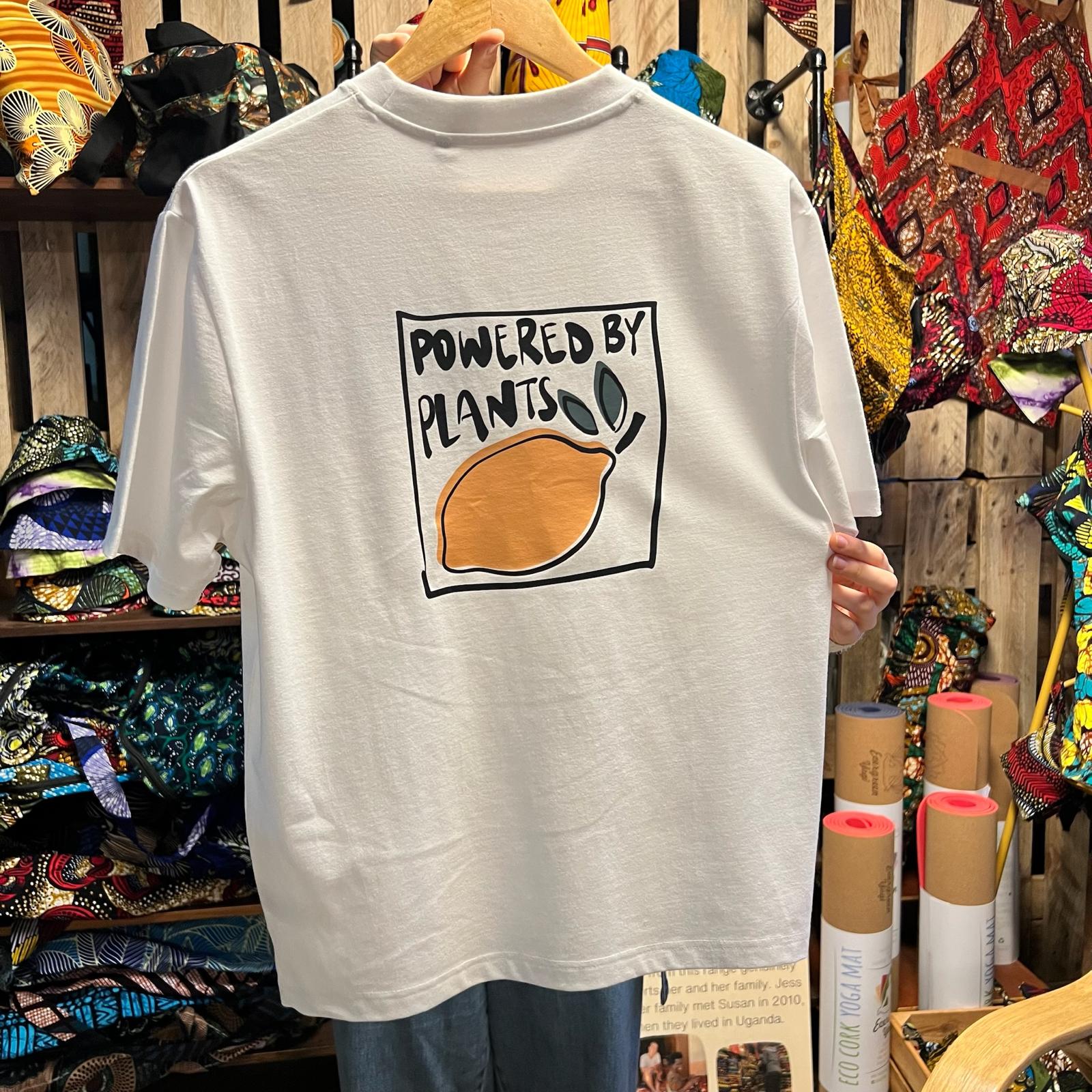Jess rocks the Powered by Plants tee in size S, styled with an oversized fit and tied up for a playful look. Her father also wears a size S in the Earth tee.