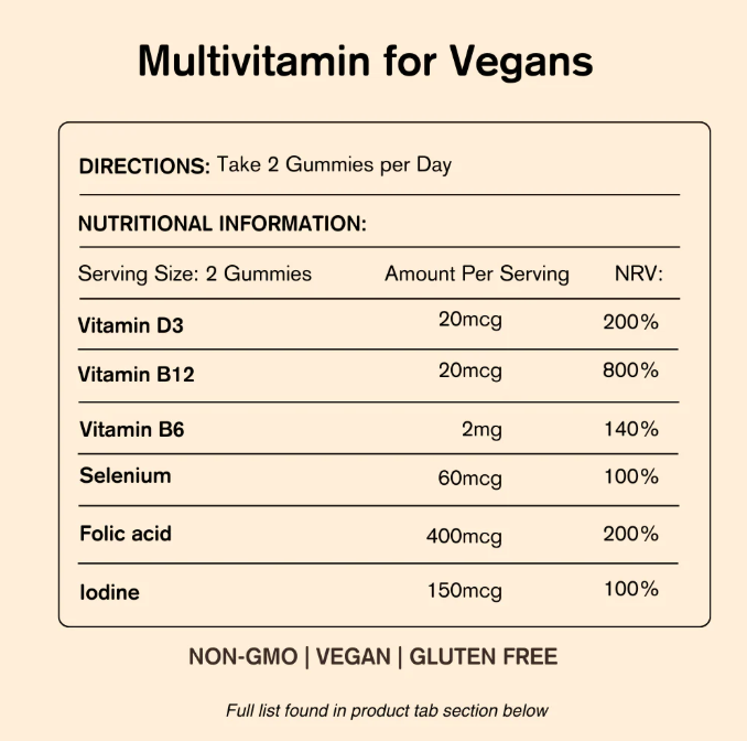 Each gummy is packed with vitamins and minerals tailored to a vegan lifestyle: