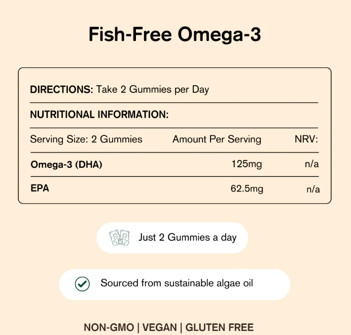 Support your brain, heart, joints, eyes, skin, and immune system with our delicious Fish-Free Omega-3 Gummies. Made from sustainably sourced marine algae, these mango-flavoured gummies deliver DHA and EPA - the essential omega-3s your body needs - without fish oil, making them perfect for vegans, vegetarians, and the whole family.