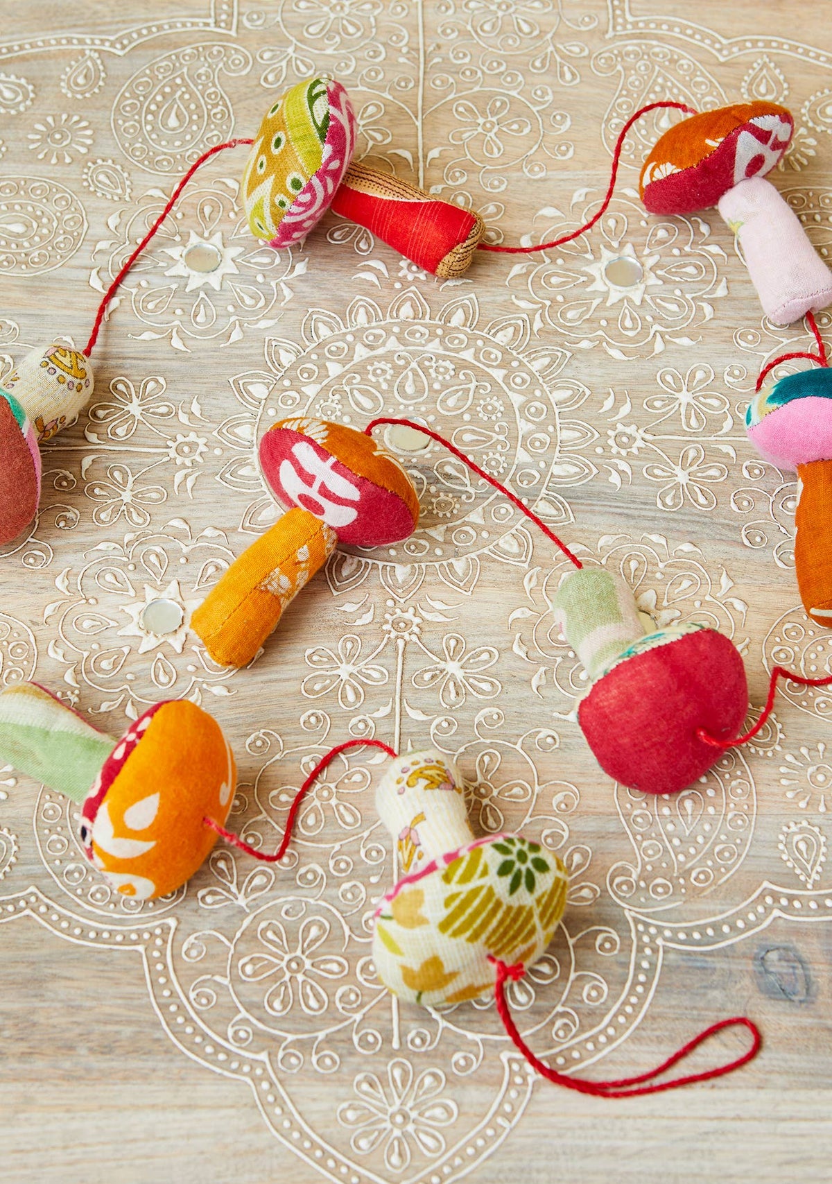 String together eight charming fabric mushrooms in a riot of recycled sari colours to craft a whimsical woodland vibe.