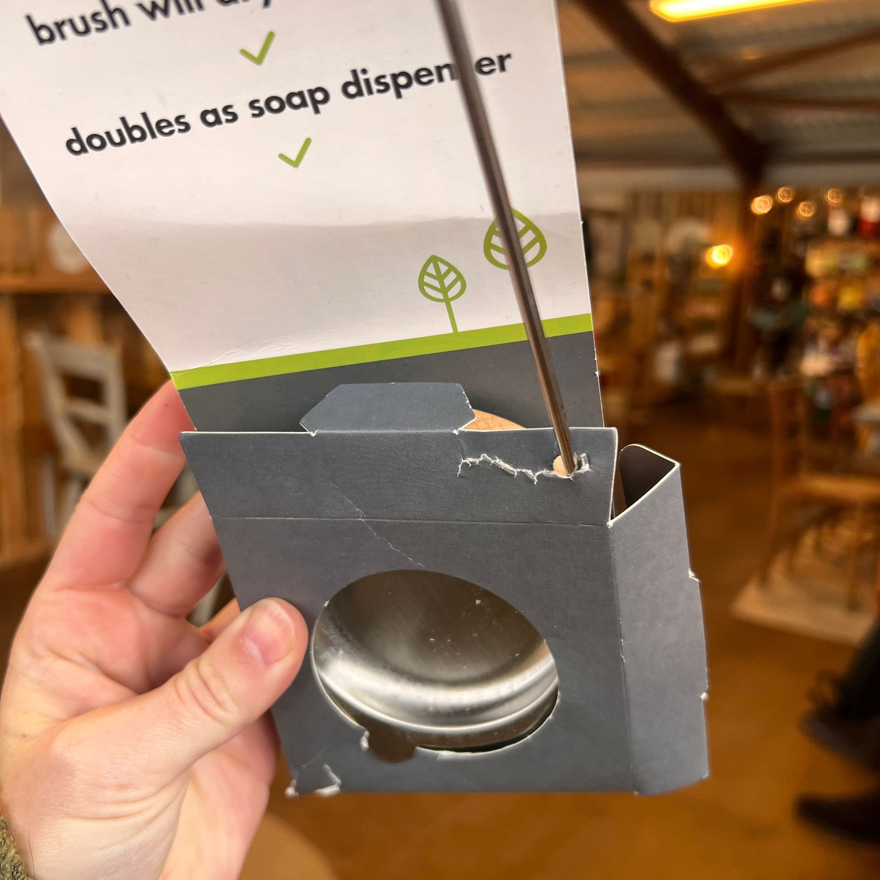 A handy stand for your dish brush. This holder allows your dish brush to dry naturally. Use the tray as a dish soap dispenser. Made with an FSC® certified beech wood base and stainless steel tray. Stand only, no dish brush included.